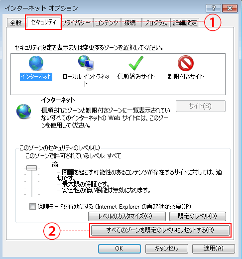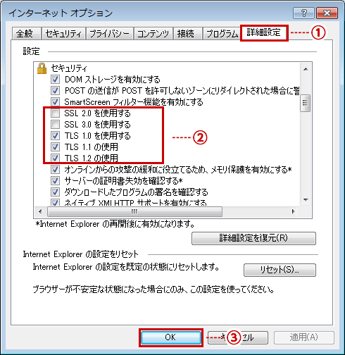 お使いのブラウザの設定をご確認いただき、「SSL2.0を使用する」「SSL3.0を使用する」「TLS1.0を使用する」のチェックを外して、「TLS1.1を使用」「TLS1.2を使用」にチェックをつけ、OKボタンを押してください。