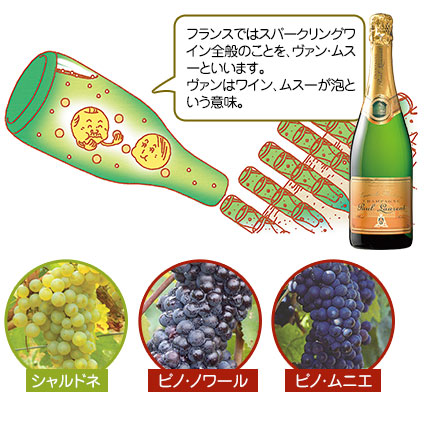 シャンパーニュ地方以外の7つの産地で、シャンパーニュと同じ瓶内二次発酵製法で造るスパークリングワインです。アルザス、ブルゴーニュ、ロワール、ジュラ、ボルドー、ディー、リムーの7つで、クレマン・ド・リムーのように産地名を付けます。品種や熟成期間の規定も産地により異なり、シャンパーニュにはない魅力を持っています。なかでもリムーは、フランスのスパークリングワイン発祥の地といわれ、シャンパーニュより1世紀以上も前から、瓶内二次発酵のスパークリングワインが造られていました。