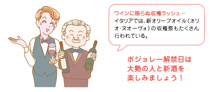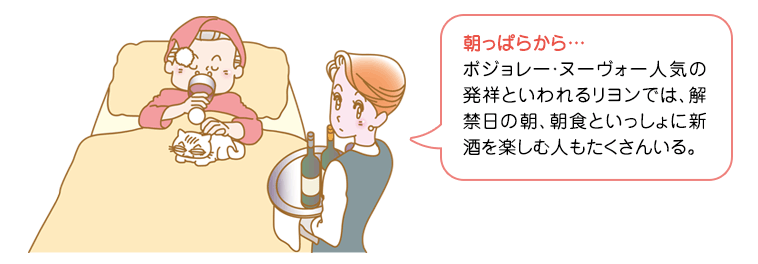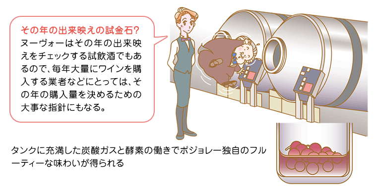 ヌーヴォーはその年の出来映えをチェックする試飲酒でもあるので、毎年大量にワインを購入する業者などにとっては、その年の購入量を決めるための大事な指針にもなる。