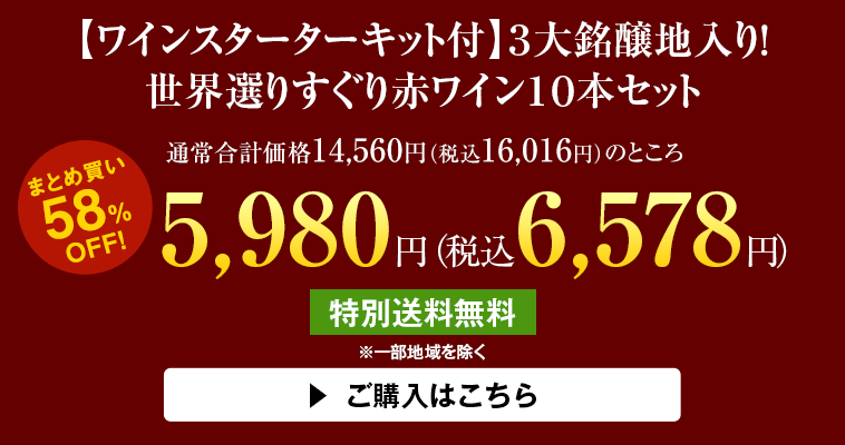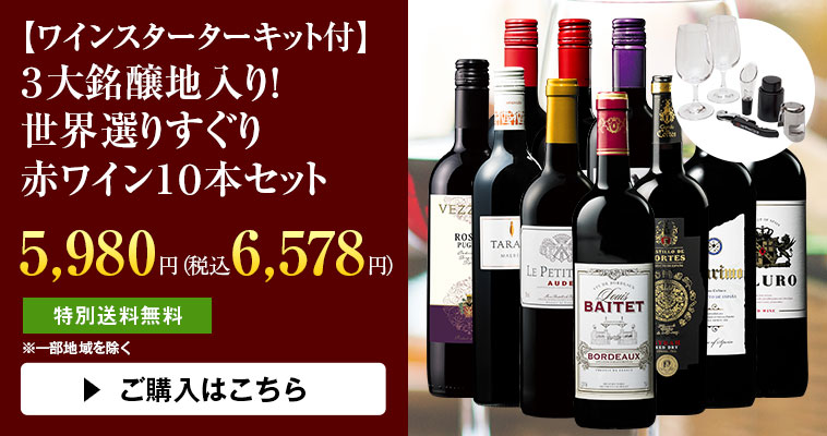 【特別送料無料】【ワインスターターキット付】3大銘醸地入り!世界選りすぐり赤ワイン10本セット