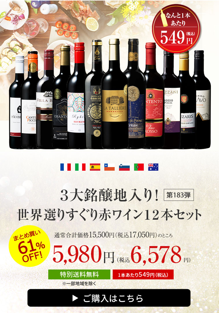 【特別送料無料】3大銘醸地入り!世界選りすぐり赤ワイン12本セット 第183弾