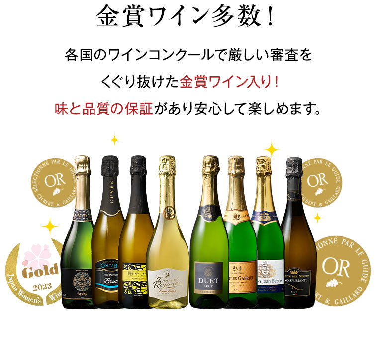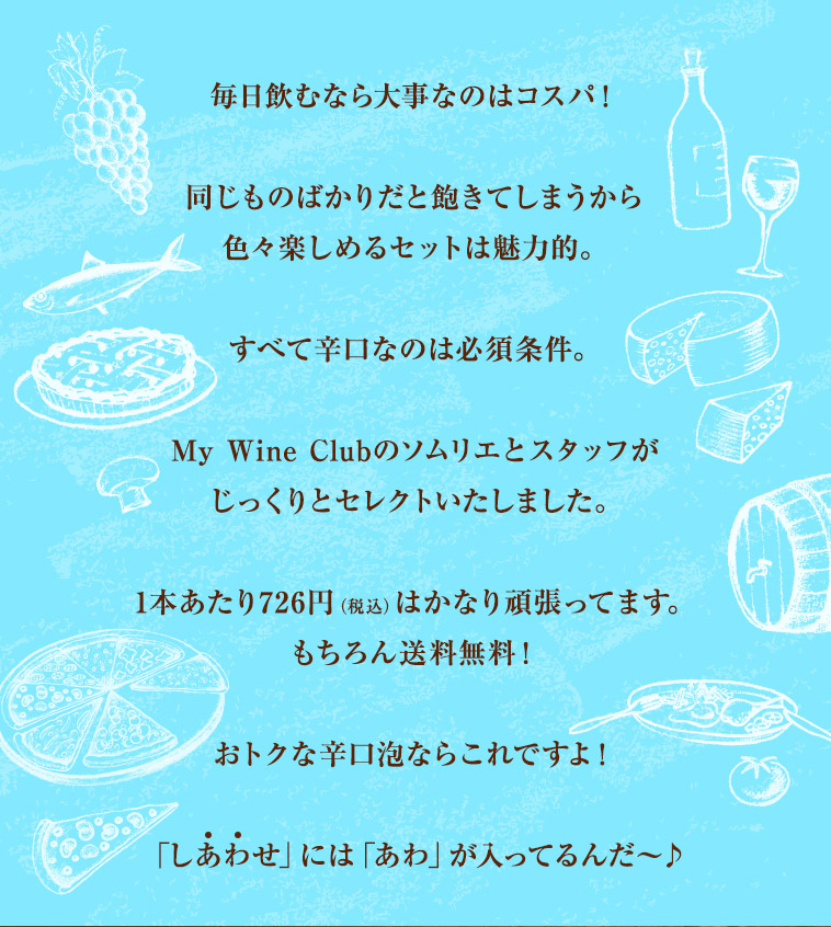 毎日飲むなら大事なのはコスパ!同じものばかりだと飽きてしまうから色々楽しめるセットは魅力的。すべて辛口なのは必須条件。My Wine Clubのソムリエとスタッフがじっくりとセレクトいたしました。1本あたり726円(税込)はかなり頑張ってます。もちろん送料無料!おトクな辛口泡ならこれですよ!「しあわせ」には「あわ」が入ってるんだ~♪ オススメポイント フランス・イタリア・スペインの 3大ワイン産地を飲み比べできる! 金賞ワイン多数!各国のワインコンクールで厳しい審査をくぐり抜けた金賞ワイン入り!味と品質の保証があり安心して楽しめます。 さらに!リーフレットもお届け! ワインがより楽しめる!同梱のリーフレットにて、お届けしたワインの・産地・ぶどう品種・当社ソムリエのテイスティングコメントなどをご紹介しております。ぜひワインと一緒にお楽しみ下さい♪