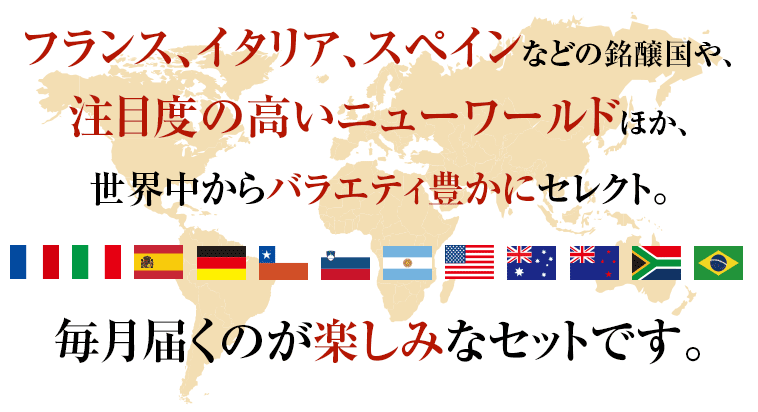 ●お届けするワインは、伝統のフランス、イタリアはもちろん、成長著しい新世界まで。毎月楽しみな頒布会です。時にはお得な組み合わせがあるかも!?