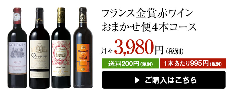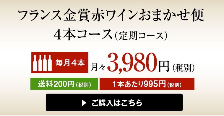 ボルドー地方を筆頭にフランスの様々な銘醸地から、コンクール金賞受賞を果たした逸品だけを毎月4本お届けします。