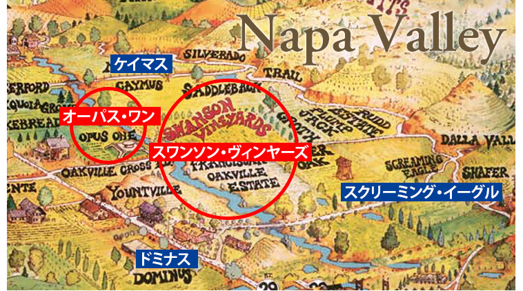 スワンソン・ヴィンヤーズのメルローの畑が、オーパス・ワンのメルローの畑とナパ・リバーをはさんで隣同士。メルローの栽培に理想的なテロワールを共有し、スワンソンはナパ・メルローの先駆者といわれています。そのほかに、オーパス・ワンよりも毎年高評価を受けるドミナスや、ナパ・カベルネの巨匠と称されるケイマス、カリフォルニア最強のカルトワインと呼ばれるスクリーミング・イーグルなど、錚々たるワイナリーたちが至近距離にあります。 分かち合う絶好のロケーション