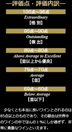 「ザ・ワイン・アドヴォケート」には広告が一切ありません。だからこそ、価格や生産者も関係なく、中立で客観的に採点されるパーカーポイントが大きな支持を集めています。また、それまで評価や解釈がむずかしかったワインの味わいを、単純明快な100点法で分かりやすく説明し、世界中にワインを広めたのはまぎれもなくパーカーの功績です。 パーカーポイントの評価方法