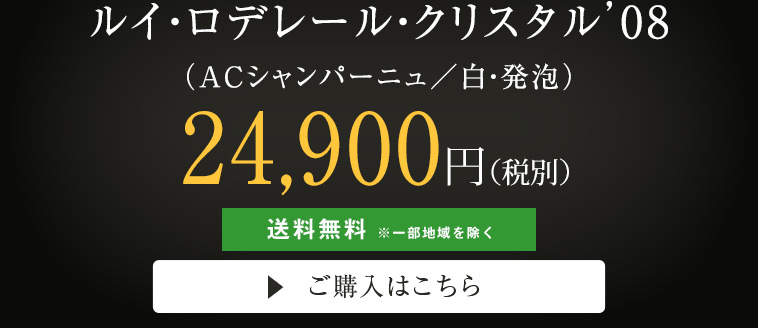 1876年に誕生し、世界最古参の「プレステージ・シャンパーニュ」のひとつと言われ、使用するぶどうはすべて自社畑のグラン・クリュから厳選されたシャルドネとピノ・ノワールのみ。気の遠くなるような手間ひまも厭わないで、瓶詰め後6年間もの熟成期間をかけてゆっくりと造り上げます。かつてはロシア皇帝だけしか飲むことが許されなかった、皇帝特別仕様の「クリスタル」。さらにグレートヴィンテージの2008年という見逃せない逸品です。