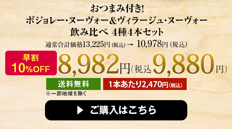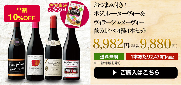 【早割10%OFF】おつまみ付き!ボジョレー・ヌーヴォー&ヴィラージュ・ヌーヴォー飲み比べ4種4本