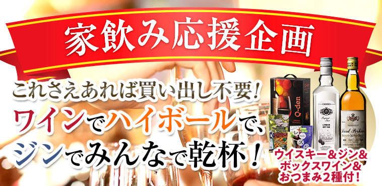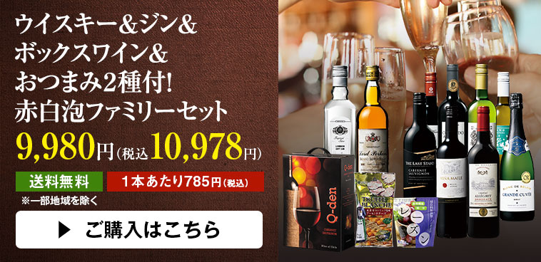 ウイスキー&ジン&ボックスワイン&おつまみ2種付!赤白泡ファミリーセット