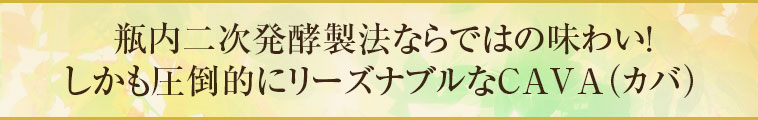 スペイン北東部・地中海沿岸のカタルーニャ地方のぶどうで主に造られているスパークリングワイン。白ワインを瓶内でさらに発酵させる「瓶内二次発酵製法」で、その品質とコストパフォーマンスの高さで、世界的な人気を誇っています。