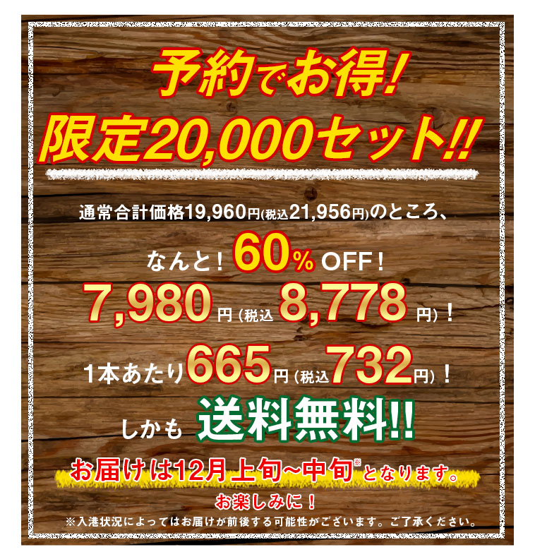 ① 予約商品につき、お届けは12月上旬から中旬です。入港状況によってはお届けが前後する場合がございます。ご了承ください。