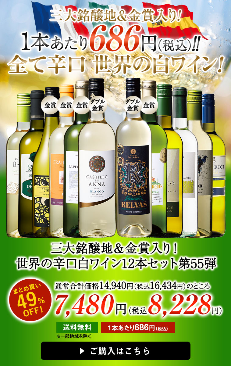 【49%OFF】三大銘醸地&金賞入り!世界の辛口白ワイン12本セット 第55弾