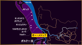 ジロンド河左岸の下流にあるメドックは、優れた赤ワインの産地。メドックの中に河口に近い順から、サンテステフ、ポイヤック、サンジュリアン、リストラック、ムーリ、マルゴーの6村があり、ボルドー5大シャトーのうちの4つをはじめ、有名シャトーが集中する激戦区です。