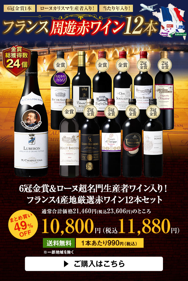 6冠金賞&ローヌ超名門生産者ワイン入り!フランス4産地厳選赤ワイン12本セット
