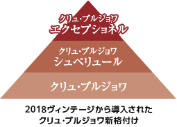 【クリュ・ブルジョワ】 クリュ・ブルジョワとは、メドック地区の格付けの一種で、メドック格付けの「グラン・クリュ」に次ぐカテゴリーとしての役割を担っています。1932年に始まり、様々な品質保証制度のあり方を経て、2018ヴィンテージから新たな信頼の証としての格付け制度が始まりました。
